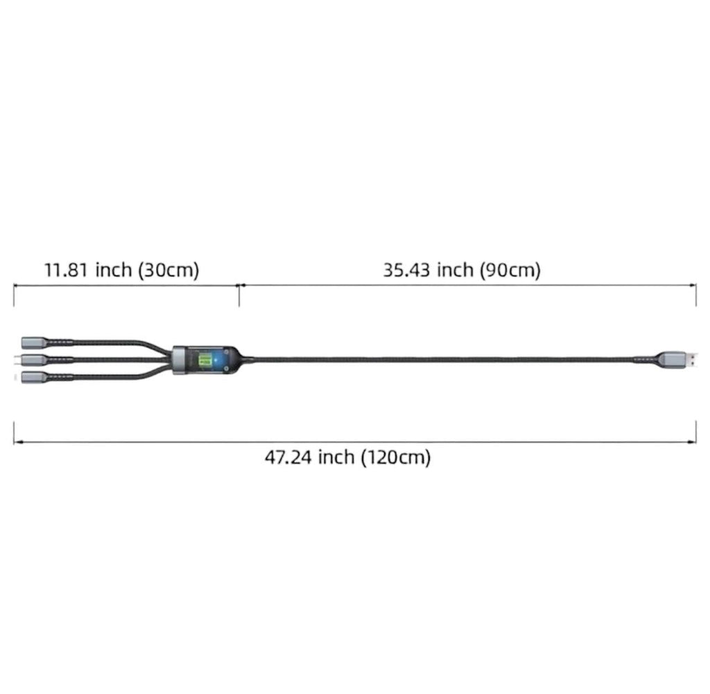 Power up all your devices with one durable solution. This 3-in-1 Fast Charging Cable supports up to 100W output, making it perfect for phones, tablets, power banks, and more. Features USB-A input with 3 outputs: Lightning (8-pin), Micro USB, and USB-C – all in one cable.