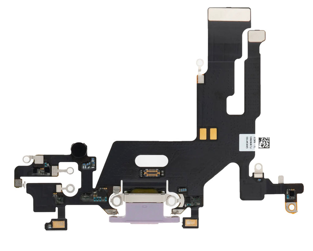 Restore power and voice functionality with this Purple Charging Port Flex Cable, designed for the iPhone 11. This internal part includes a color-matched USB port, microphone, and antenna connector—ideal for both repairs and housing color changes.