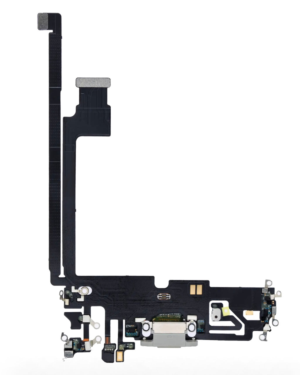 Replace a damaged or unresponsive port with this Silver Charging Port Flex Cable for the iPhone 12 Pro Max. It includes the charging connector, data sync functionality, and bottom microphone, all color-matched to black housings.