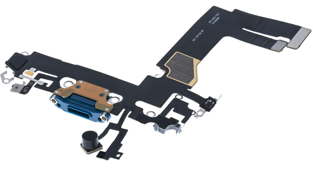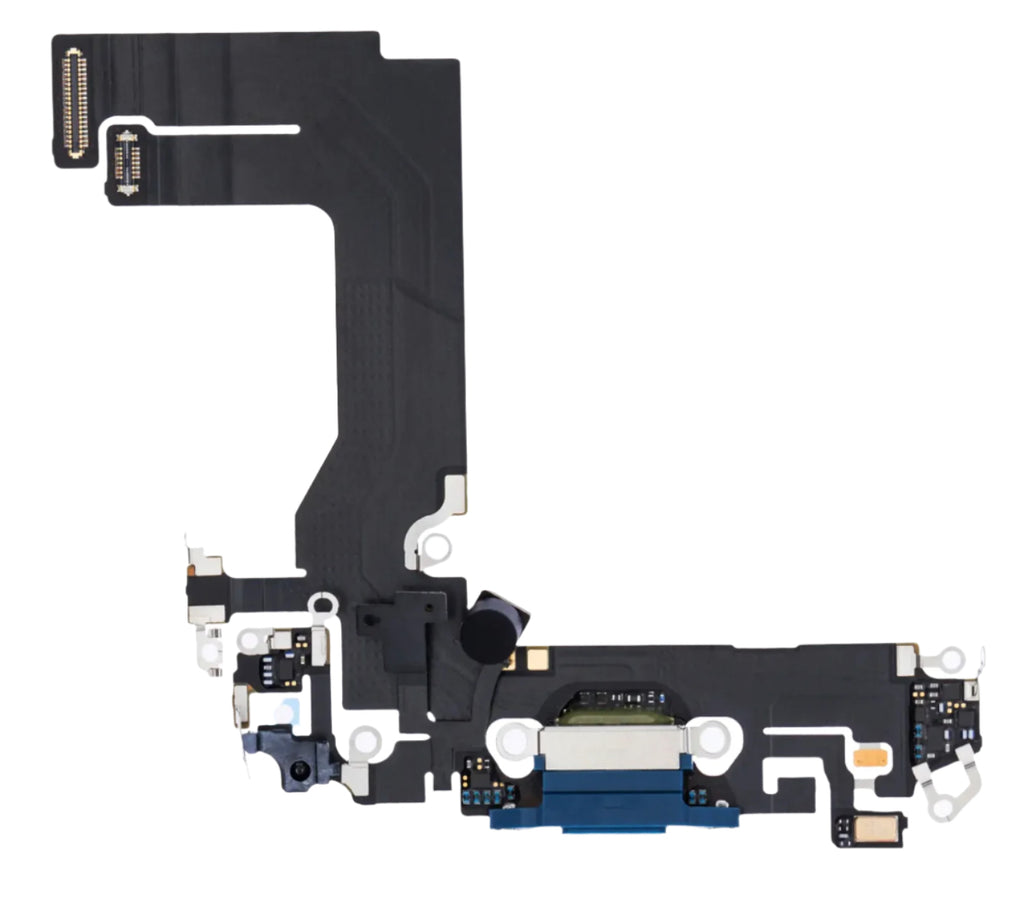 Fix charging, syncing, or microphone issues with this Blue Charging Port Flex Cable for the iPhone 13 Mini. This internal replacement part restores full USB charging and data transfer along with voice input via the bottom mic, in a color-matched blue housing finish.