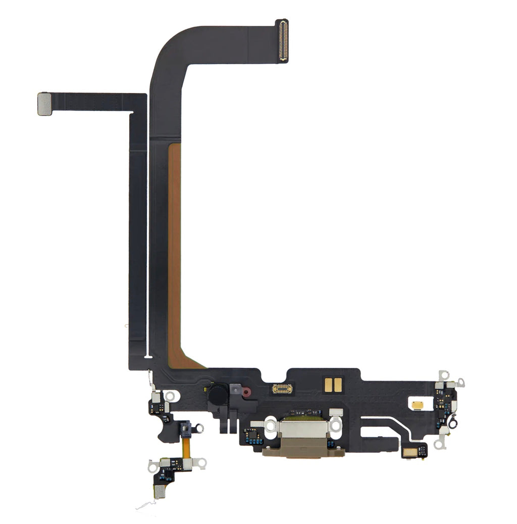 Restore charging and microphone functionality with this Gold Charging Port Flex Cable, compatible with iPhone 13 Pro Max. This part features a color-matched charging port, microphone, and internal flex connector that integrates with the logic board.