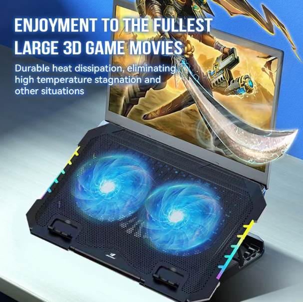 Ultra-Thin RGB Laptop Cooling Pad – Powerful, Stylish & Portable – Keep your laptop cool and your desk stylish with this dual-fan cooling pad. Featuring 10 RGB lighting effects, ergonomic design, and quiet performance, it's perfect for gaming, office work, or daily use on the go.