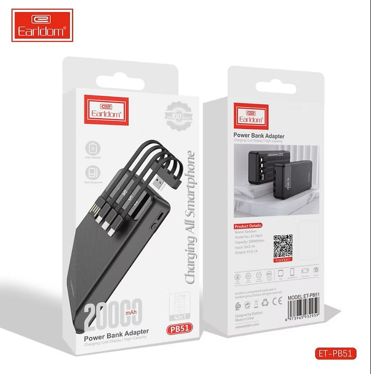 20000mAh High-Capacity Power Bank – 4-in-1 Cable, LED Display, Multi-Device Support – Stay charged wherever you go with this powerful and versatile 20000mAh portable charger. Built for convenience and compatibility, it comes with an integrated 4-in-1 charging cable and an easy-to-read LED display.