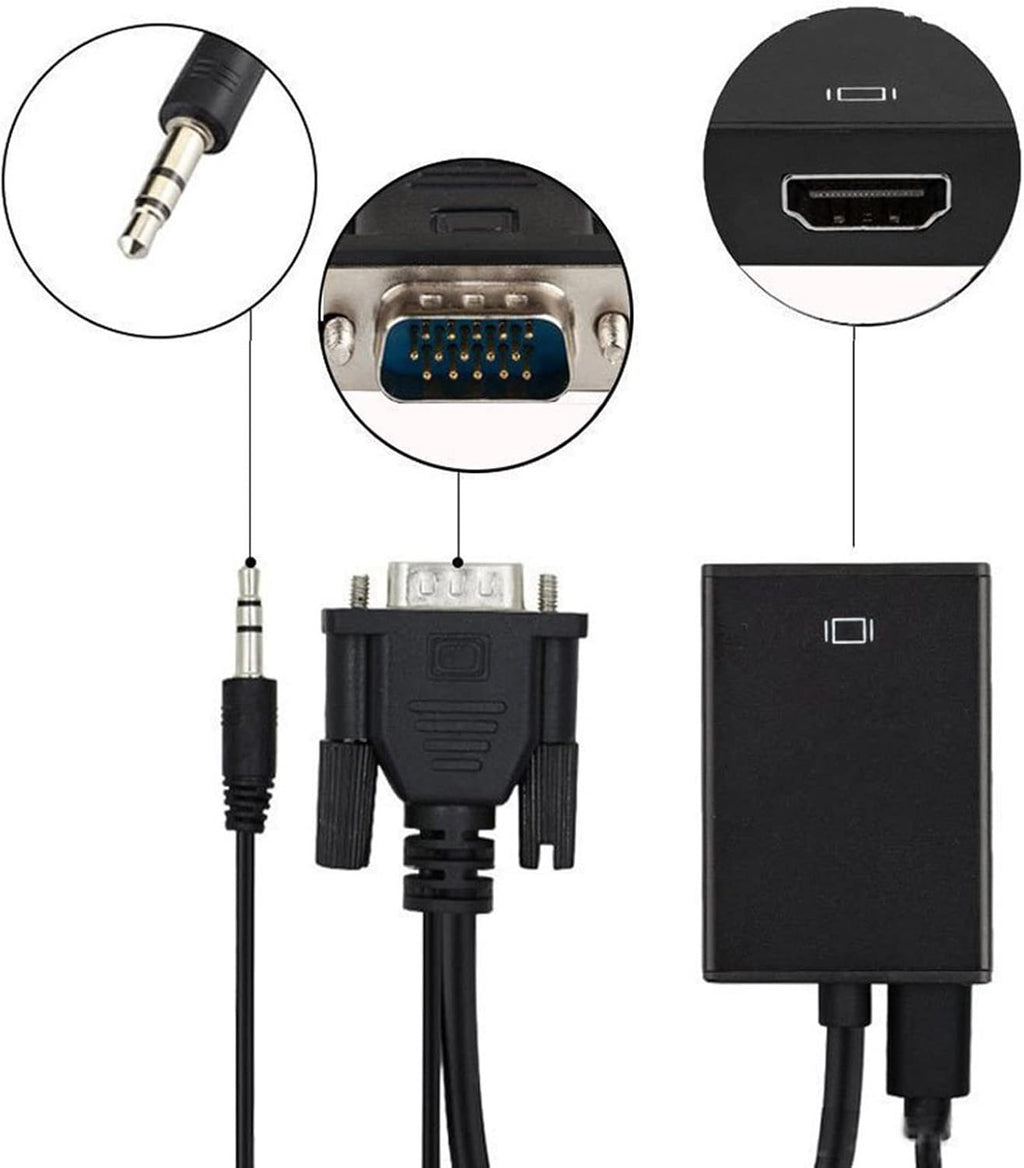 This VGA to HDMI Adapter with AUX Cable seamlessly converts analog VGA signals to digital HDMI output, complete with audio sync via the included 3.5mm AUX cable.